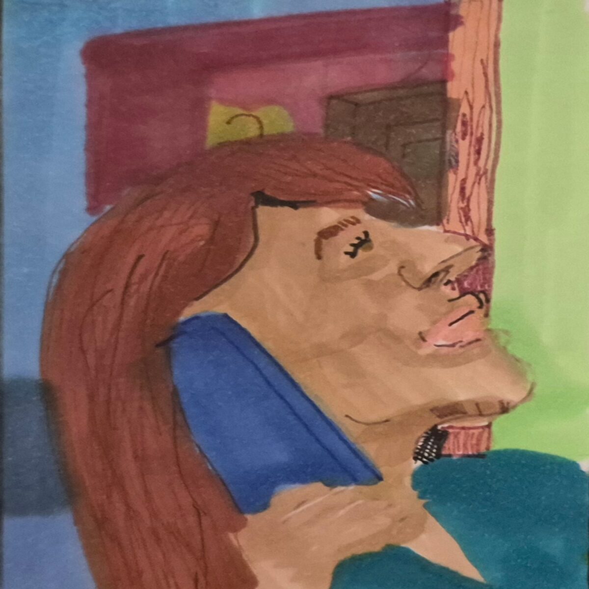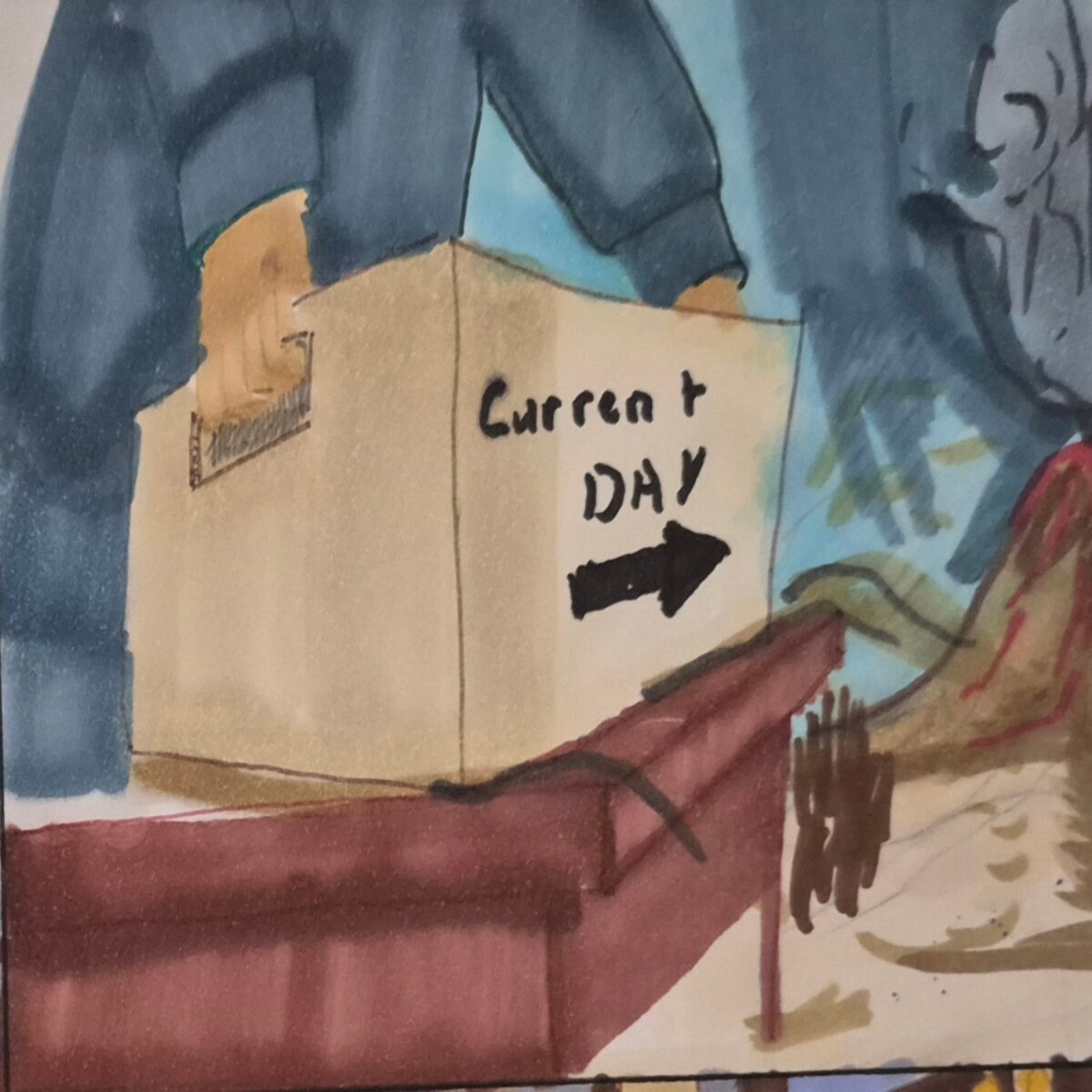 the bald spot of light that is right behind a figure walking to a gate that has a car light or house light that illuminates the path walked. A narrowing, uneven patch of dirt to a patch of grass and a concrete step that led to a house. The lines are wavy, and the panel conveys that the figure is drunk, and the inferences allow the experience to be conveyed. If there is a car, then what truly is conveyed? The few questions that can arise while the piece is being taken in. Then again, the best has gone. A few remain after this. Be kind to those yet to go.